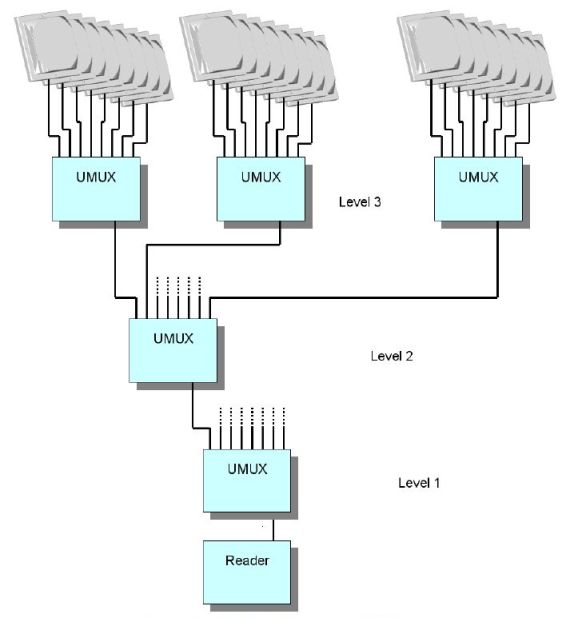 Grazie ad una innovativa progettazione dell'elettronica è possibile collegare in cascata più multiplexer per aumentare il numero delle antenne connesse ai reader (512 antenne per ogni uscita RF del reade). I multiplexer possono anche essere indirizzati attraverso DIP switch.